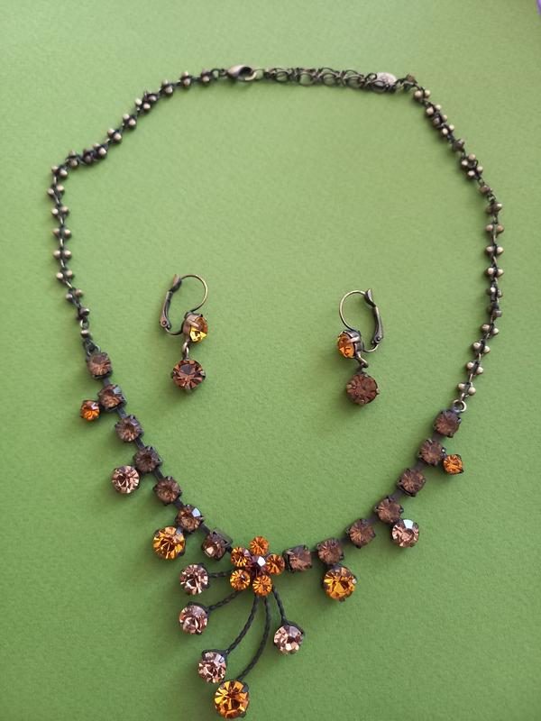 колье и серьги в осенних тонах, стекло, металл под бронзу