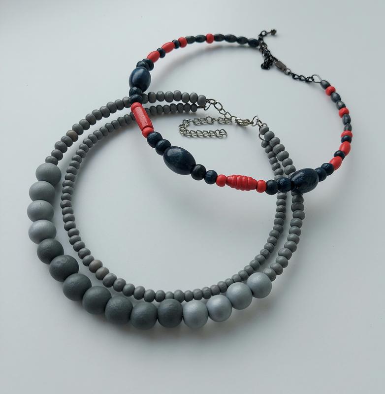изготовлены из деревянных бусин на металлической основе. носятся близко к шее, длина самого украшения около 37 см, еще где-то 3 -4 см можно добавить за счет цепочки. стоимость серого - 81 грн, темного синего - 57грн. оба можно купить за 120 грн
