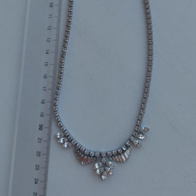 Вiнтажне колье в стилi арт деко. Багети, метал. Метал i кристали в iдеальному станi. Три кристаллика на застобци имеют пожелтение. Возможно, была пищеобразная цепочка беля замка, осколки э отверстия для этого, все шне - в iдеальном состоянии.