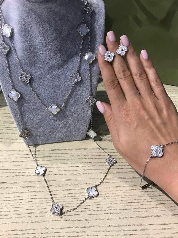 Элегантные и стильные украшения стиль Ванклиф, клевер. Подвеска на 1 или много элементов. На всех подвесках есть гравировка и проба. Подвеску можно приобрести комплектами с кольцами, серьгами и браслетами. Серьги есть гвоздики или английский замок. Серьги имеются на 1, 2, 3 или 4 элемента. Все украшения можно приобрести в подарочной упаковке.