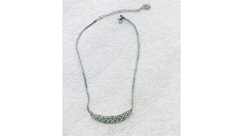 Колье под серебро с регулируемой застёжкой. Длина - 36,5 - 47 см Ширина - 1 см. Ньюанс на фото-нет одного камешка. Производство: Китай. Отправка УП.