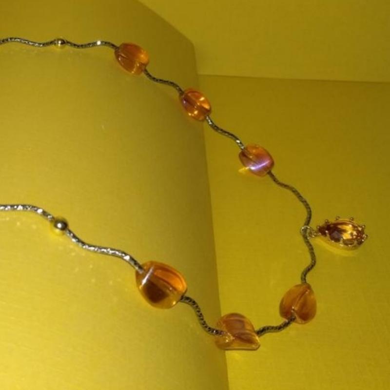 С бусинки трубочек волнистой формы серебряного цвета, бусинки хрустальных 12мм#9мм оранжевых треугольной изогнутой формы, бусины золотистых круглых из натурального Гематита, имеет подвеску 11мм#17мм в виде капли хрустального оранжевого цвета и застежку | сердце|. Длина 44 см