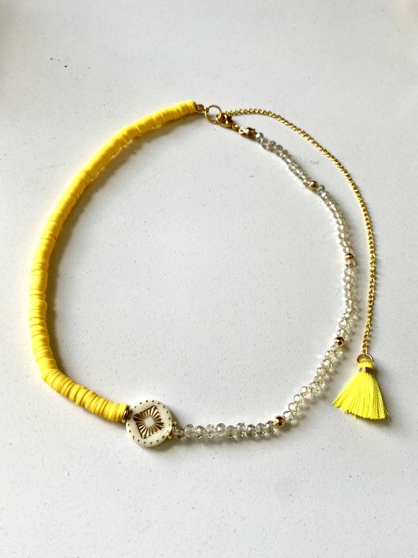 Сонячний чокер Мінімалістична прикраса з сонячним символом по середині. Яскрава китиця щоб прикрасити спину. Для всіх хто любить жовтий колір та золотий блиск. Жовтий колір знання, просвітлення, пізнання. Колір пробудження весни та розуму. Бо жовтий — це колір сонця.
