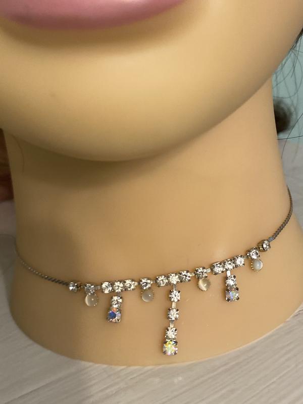 Маленькое нежное колье, чокером оно не может выглядеть, так как минимальная длина цепочки 40 см, плюс 7 см дополнительно. На тонкой шее будет выглядеть как маленькое колье. Изготовлено из белого металла. Стразы белого цвета, три нижних с радужным отливом, также 4 штуки круглых кабона типа кошачий глаз белого цвета. Центральная часть свисает на 2,5 см