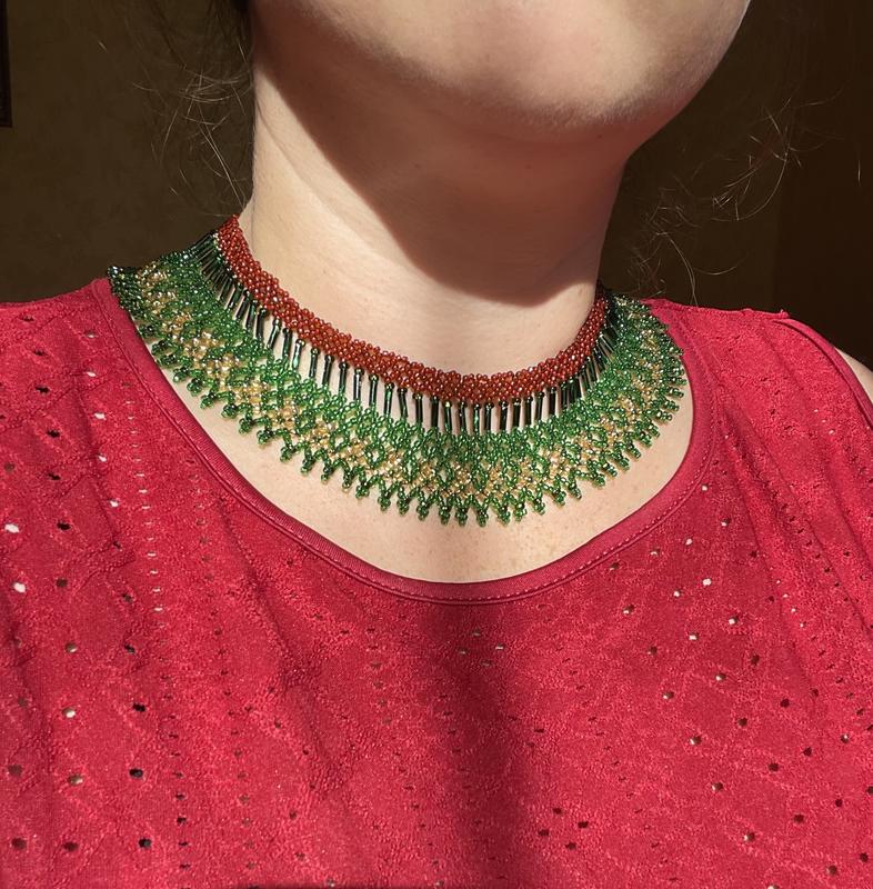 Силена сочетает в себе современные тренды и традиционные мотивы! Это украшение выполнено в ярких красных и зеленых тонах, идеально подходящих для стильного образа или этнического акцента. Фурнитура выполнена из нержавеющей стали, что гарантирует долговечность и стильный вид. ✅ Особенности: • Ширина: 4 см • Длина: 36 см + 5 см удлиняющая цепочка • Фурнитура из нержавеющей стали • Трендовые красно-зеленые цвета • Использование прочной нити и японского бисера • Ручная работа.