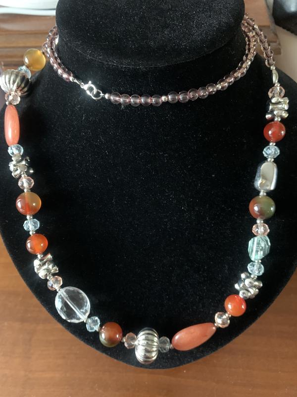 Колье - бусины стекло, пластик. Вставки сердолик и агат. Длина 40 см