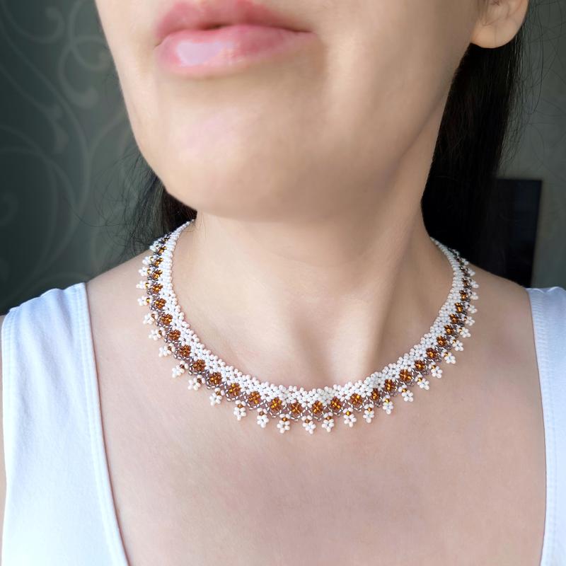 Деликатное колье из бисера, которое не оставит вас без внимания🤎🤍 🔹качественный чешский бисер Preciosa 🔹прочная нить для бисероплета 🔹фурнитура из медицинской стали (гипоаллергенная, не ржавеет) 📏Стандартная длина - 35 см. Возможно исполнение по вашим меркам. Необходимо знать обхват шеи ближе к плечам. 📏Ширина – 1.8 см
