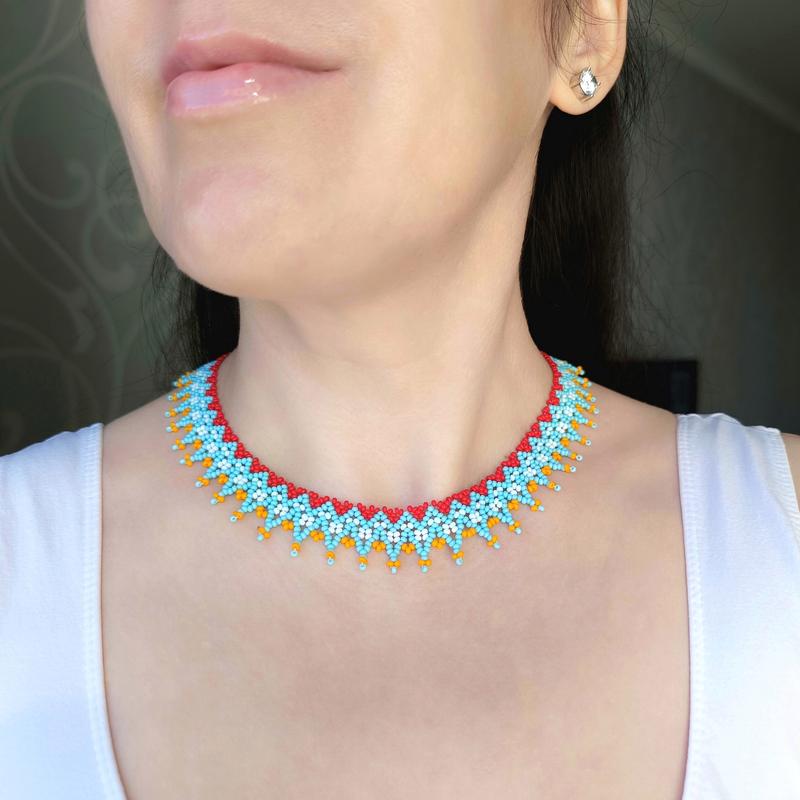 Колье из бисера ❤️🧡🤍 🔹качественный чешский бисер Preciosa 🔹прочная нить для бисероплета 🔹фурнитура из медицинской стали (гипоаллергенная, не ржавеет) 📏Длина по внутреннему кругу полотна - 35 см + 5 см удлинитель. Возможно исполнение по вашим меркам. Необходимо знать обхват шеи ближе к плечам. 📏Ширина – 2 см