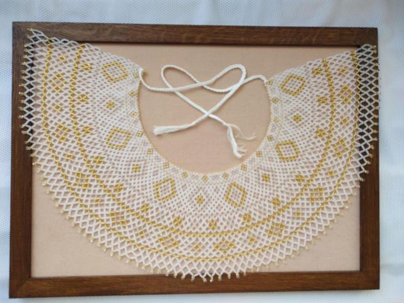 Довжина (окружність навколо шиї ) 39 см з мотузками з бавовни 30 см. Можна носити як комір (на плечах). Ширина 14 см. Чеський та японський бісер. Ручна робота. Автор схеми Сторож Людмила.