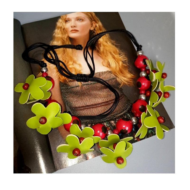 Дорогие друзья, представляю вашему вниманию оригинальное яркое колье интересного дизайна, выполненное вручную из комбинированных материалов: искусственная кожа, деревянные бусины, веревка, металл. Колье выглядит гармонично, стильно и жизнеутверждающе. Сочетание форм и цветов напоминает о весне, ярком лете и создает позитивное настроение Колье будет отправлено вам в подарочной коробке, поэтому может стать готовым подарком женщине, маме, подруге, тете или себе😊 Колье станет хорошим подарком на День матери, Рождество, день рождения, годовщину свадьбы, помолвку или просто по любому поводу в качестве сюрприза. Размер: максимальная высота 43 см, т.е. общая длина 86 см. Длина части с бусинами 30 см. Диаметр цветка 4,3 см. Диаметр деревянных бусин 1,8 см. Материалы: искусственная кожа, дерево, металл, веревка. Состояние новое.