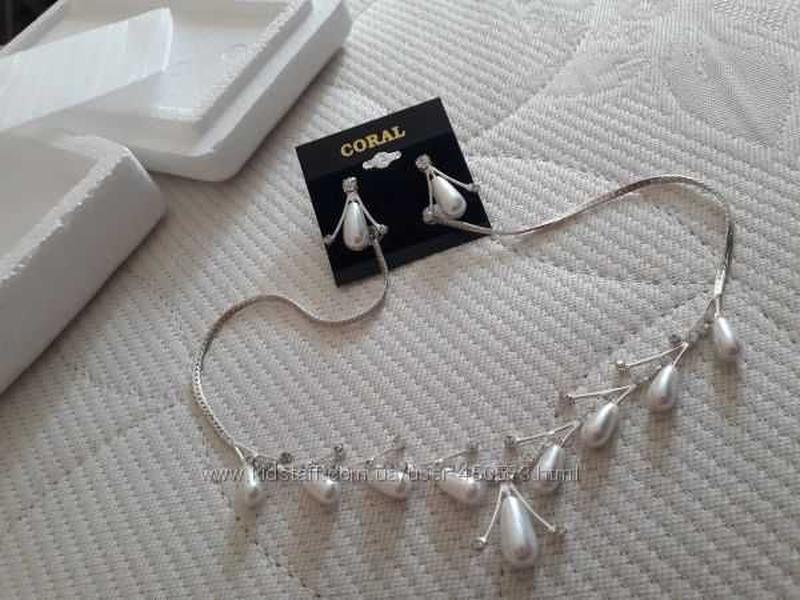 Колье украшение к праздникам, имеет 43-48 см длина. Белого цвета металл под серебро. Смотрится очень мило. + серьги. Легкое