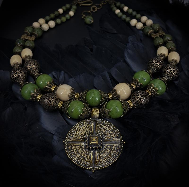 Ожерелье" Величественное ". Собрано из очень красивых бусин нефрита ( 16 мм), жада и также приятных на ощупь и красивых, белых бусин изготовленных из смолы. Центральным элементом ожерелья является изгарда, отличная авторская работа, латунь, d 5 см. Длина ожерелья по короткой низу 49 см + 5 см удлинитель.