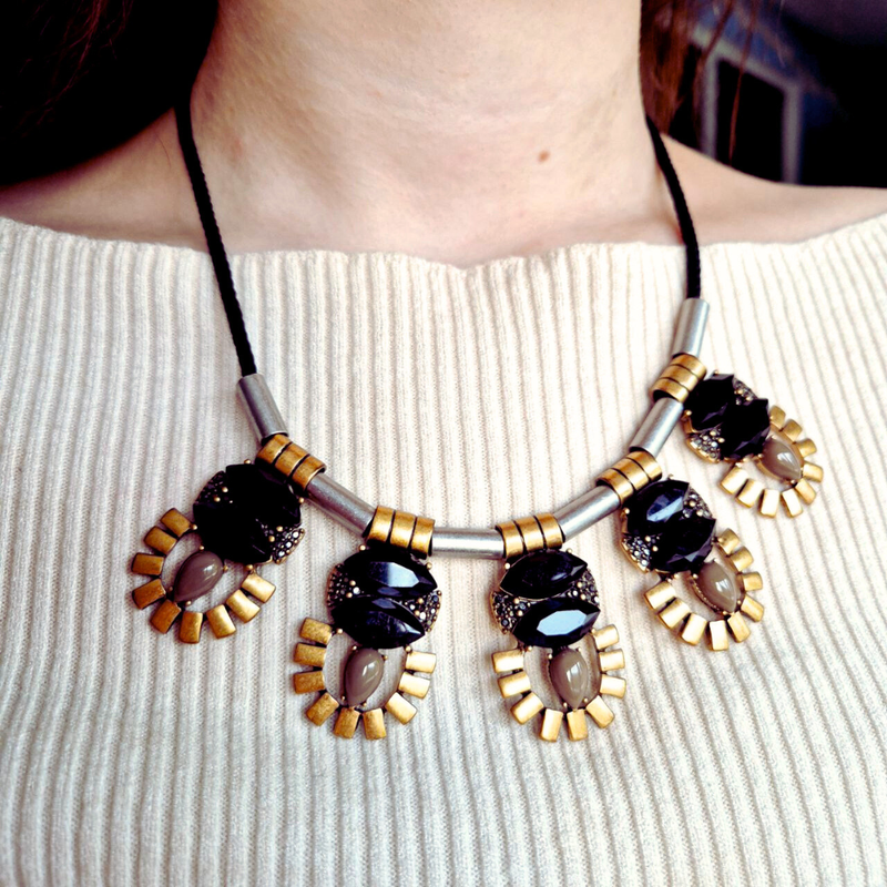 Стильна +/- сучасна прикраса від мериканського бренду J.CREW в етнічному стилі. Основа кольє - чорний текстильний джуг. Його прикрашають 5 декоративних елементи зі сплаву кольору "старе золото", які декоровані пластиковими кристалами. Між ними - сріблясті намистини-тубуси. Застібка - крупний шпрингель. Маркована бірка + рідний мішечок. Довжина - 44 см + 7 см подовжувача. Стан гарний з мінімальними слідами чау на застібці. Доданий відеоогляд.