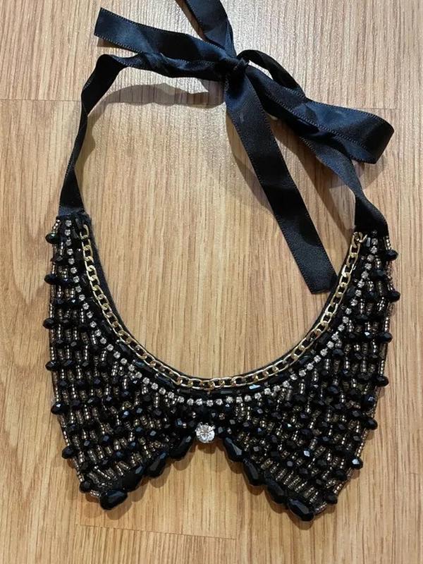 Продаю гарний комірець чорного кольору з бісером. Одягала декілька разів. В хорошому стані. Завʼязується стрічками. На стрічках є потертості, не сильно помітні.