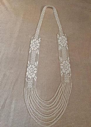 Круговой гердан выполнен в технике станочного ткачества бисером. Белый матовый цветочный орнамент на прозрачном белом фоне напоминает морозный узор. Гердан изысканный и красивый. Длина гердана по внутреннему кругу 76 см, ширина 3.5 см.