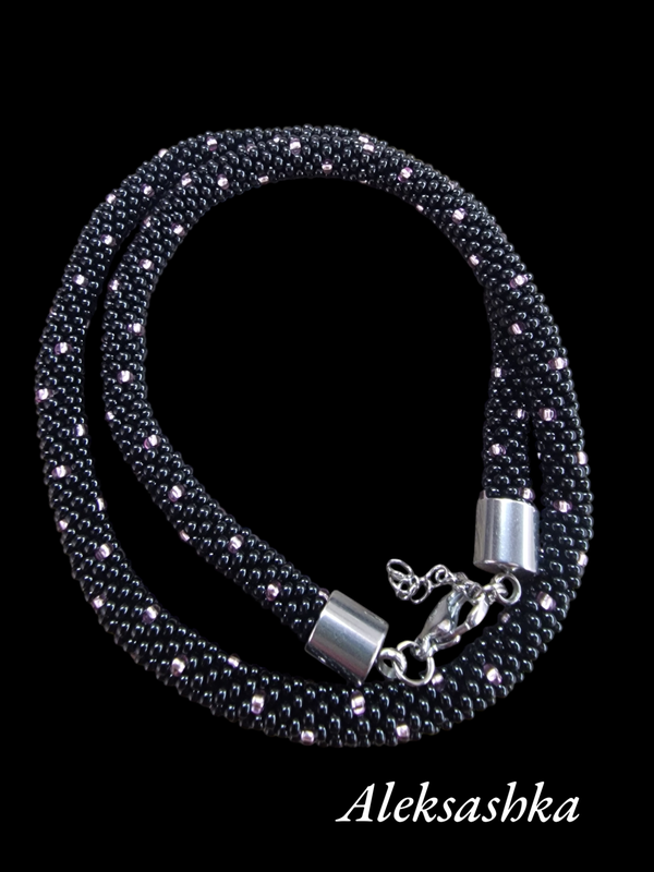 Жгут из бисера. Вязаный крючком. Длина 43см. Цвет бисера: черный+розовый.