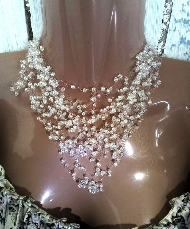 кольє стилізоване під павутинку з краплями роси на ній, що іскряться, виглядає цікаво можна моделювати на шиї - розтягувати по грудях, чи навпаки, підібрати його під чокер