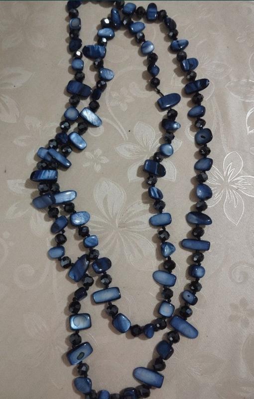 Состояние идеальное. Длинное однониточное колье из самородков и граненых хрустальных бусин темно-синего цвета. Длина 110 см. Удобна в ношении, не застегивается, поэтому можно надевать через голову. Очень универсальны – носите их длинными, дважды оберните вокруг шеи, завяжите узлом.