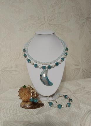 Ожерелье из двух. Натуральные камни аквамарин, кварц. Лунный камень. Длина первого 48см+ кулон 5см и 44 см вторая.Длина браслета 20см. В подарок серьги.