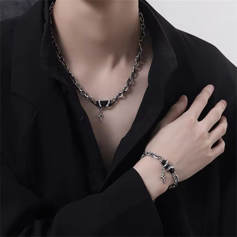Набір у стилі Y2K готика. Ланцюг на шию і браслет на руку з підвіскою зірка і чорним каменем. Переплетені ланцюжком у чорному кольорі. Унісекс Матеріал:нержавіюча сталь+ титан Розміри:ланцюг 47 см+7 см, браслет 16 см+ 5 см