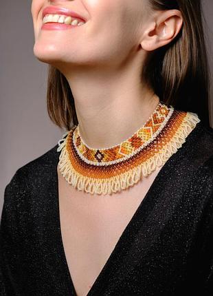 Бісерна прикраса, створена у теплих відтінках нашою майстринею-художницею з міста Городенка. У силянці гармонійно поєднуються молочно-оранжево-бордові відтінки, із плавними переходами, а також глянцеві та матова текстури бісеру. Матеріал - чеський бісер. Ширина 6 см Бавовняні завʼязки із китицями