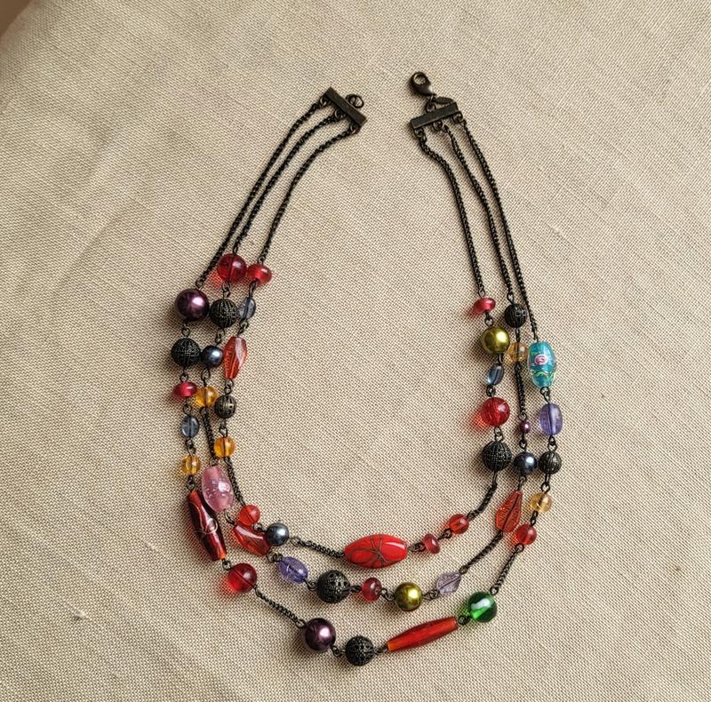 колье в Boho стиле от Avon. Превосходное разноцветные трехрядное колье в темном металле. Маркировка есть, есть также метка SP - скорее всего silver plated. Стан красивый, бусины яркие, разной фактуры, стекло, люцит, металл. Очень атмосферное украшение. Длина 41.5см, высота 4см.