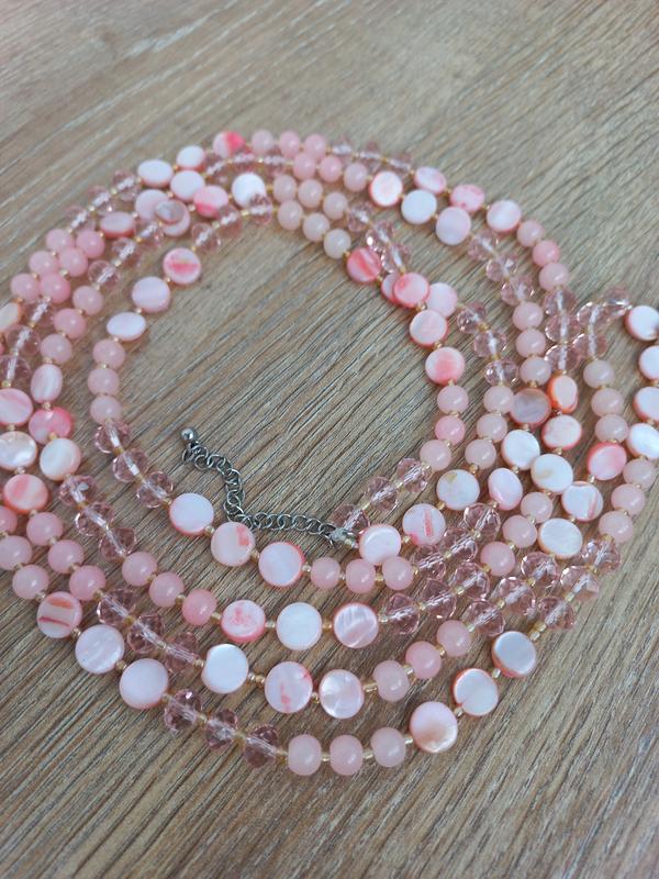 Двохрядове. Нежное. Длинное. Вместе с удлинителем 85 см. Такая длина позволяет варианты ношения. Размеры бусин смотрите по клеткам.