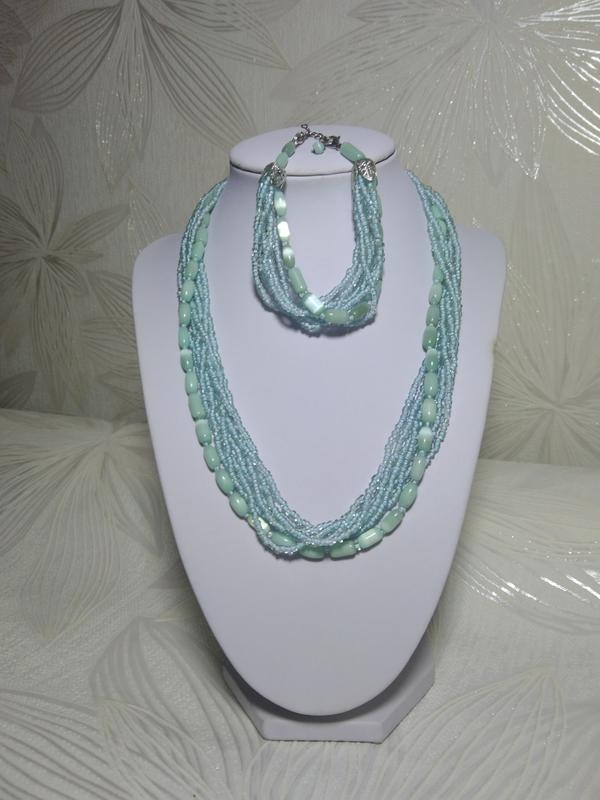 З бісеру та котячого ока. Довжина бус 48см, браслета 19+подовжуючий ланцюжок 4см.