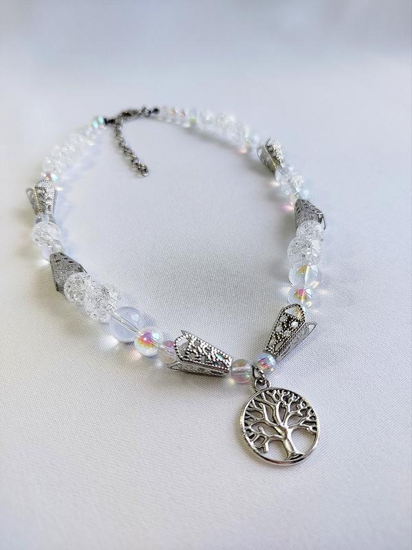 Длина внутреннего края 37 см + 6 см цепочка Очень нежные и светлые бусы. Часть бусин похожа на стеклянные крошки, а другие отражают цвета радуги. Железные вставки добавляют порядок и отделение между своеобразными узорами бусин.