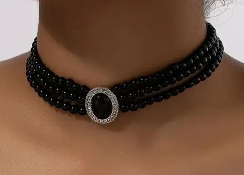 Многослойное ожерелье с черными бусинами длина 35+7 см