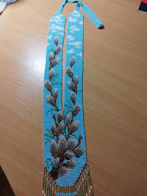 Гердан выполнен в технике ручной ткацки без станка. Использован японский бисер Matsuno (цвет шампань) и чешский бисер Preciosa. Размеры изделия: длина 51 см, ширина 7.5 см. В едином экземпляре. Внимание! Цену понижено из-за маленького дефекта при создании ггердана внизу. Есть дефект в процессе создания снизок - внизу лопнула одна бисерина, пришлось “уставлять”. Эффект показан на отдельном фото, всего лишь на одной стороне гердана, он НЕ влияет на прочность других частый изделия, просто немножко виден. если прилипать придирчиво. Да, другие мастера на это не обращают внимания клиентов, а яблоко, “как оно есть”.