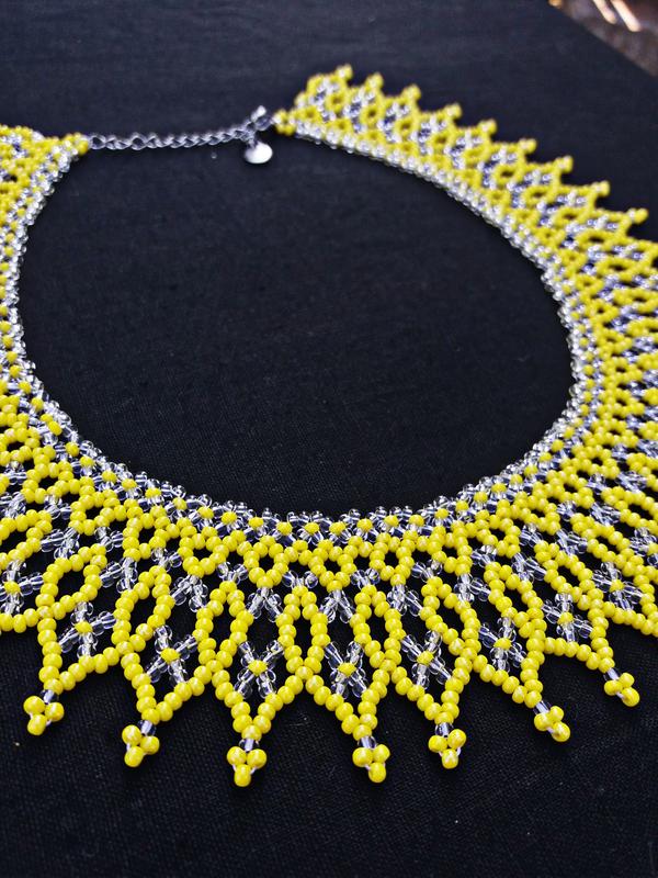 Вишукана силянка яскраво-жовтого кольору з прозорими елементами стане ідеальним акцентом для вашого образу. Жовтий бісер символізує тепло та енергію, а прозорі елементи додають прикрасі легкості й витонченого блиску. Ця силянка відмінно підходить як для святкових подій, так і для повсякденного носіння, підкреслюючи ваш індивідуальний стиль. Її яскравий, але водночас ніжний дизайн не залишить вас без уваги. Чудова ідея для подарунка! Подаруйте собі або близьким прикрасу, яка додасть теплих фарб у будь-який день. Ширина - 3,5 см, довжина по внутрішньому колу - 33 см + ланцюжок-подовжувач 5 см