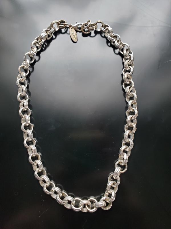 Модное цепное колье от известного бренда GEORGE, винтаж из Америки, состояние идеально с легкой патиной от длительного хранения, серебрение без повреждений, бирка с клеймом, длина 46см, ширина 10мм, тяжелое и стильное.