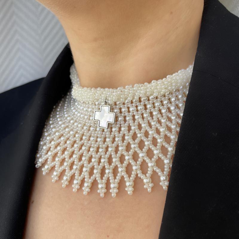 Силка молочного цвета с перламутровыми крестиком. Возможно также заказать без него) Ширина 6см, длина 34см и удлинитель