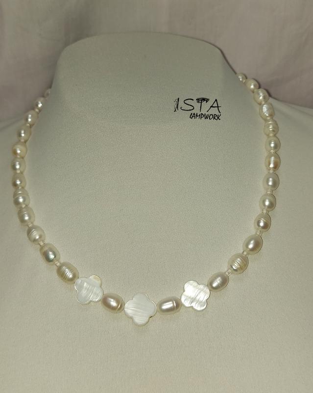 Натуральні річкові перли та три перламутрові намистини у виді конюшини На міцному металевому дроті, Срібні з'єднувачі. Намисто зроблено з дотриманням всіх технологічних процесів мною, у моїй майстерні. Дивіться додане відео, звертайтесь за додатковою інформацією. Також, прислухаюся до ваших побажань щодо розміру (можна подовжити срібним ланцюжком), 50 см