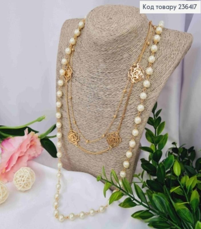 Бижутерия на шею Тройная, Розы и Перламутровые бусины, 88см, золотого цвета, Fashion Jewelry Код товару 236417