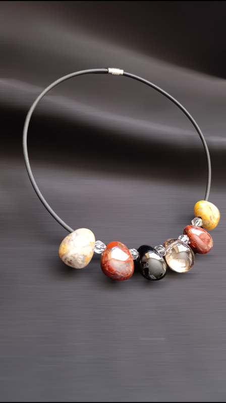 ожерелье из натуральных камней в едином экземпляре и повтор невозможен, потому что двух одинаковых в природе камушек почти не существует. на бусине присутствуют натуральные камни яшмы, Алой яшмы,агата,раузтопаза и хрусталя.сделанное оно на мемори проволоке который отделан каучуковым шнуром.