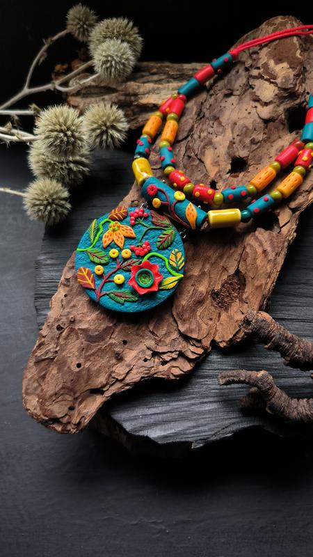 Яркое оригинальное колье с растительными мотивами выполнено из полимерной глины. Повтор может быть в других цветах. Несмотря на яркость, комплект можно сочетать с разной одеждой, создавая как повседневный так и праздничный образ.