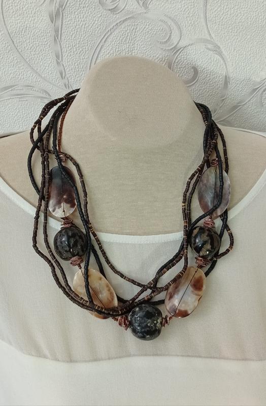 Намисто з натуральних матеріалів природного походження, перламутра, кокосових чипсів, кістянок єкзотичних рослин. Довжина 55 см + подовжувач.