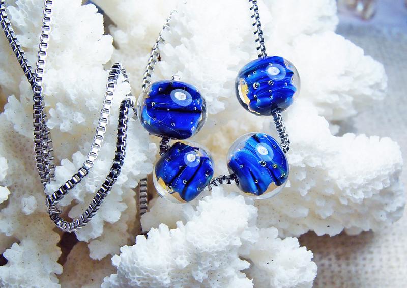 Всё бытие и сущее согласно В великой, непрестанной тишине. Смотри туда участно, безучастно, - Мне всё равно — вселенная во мне. Бусики "Вселенная" Материалы: - авторский лэмпворк - сталь ювелирная гипоаллергенная Диаметр бусины 1,2 см. Застежка карабин. Цепочка - ювелирная сталь. Красивая жестяная коробочка в комплект к бусам.