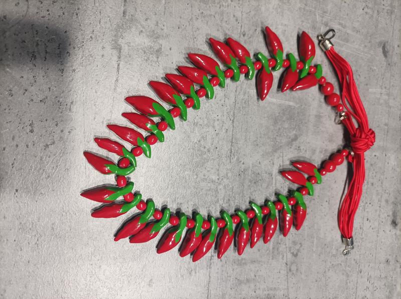 Стильное ожерелье с перчиками, пластиковое, легкое, можно носить как чокер, сняв текстильную часть и переставив застежку крючок. Круто смотрится в современном образе с майкой и джинсами. Размеры на фото: с текстильной частью 64 см, без нее 42. Есть нюанс на одной бусине - показано на последнем фото.