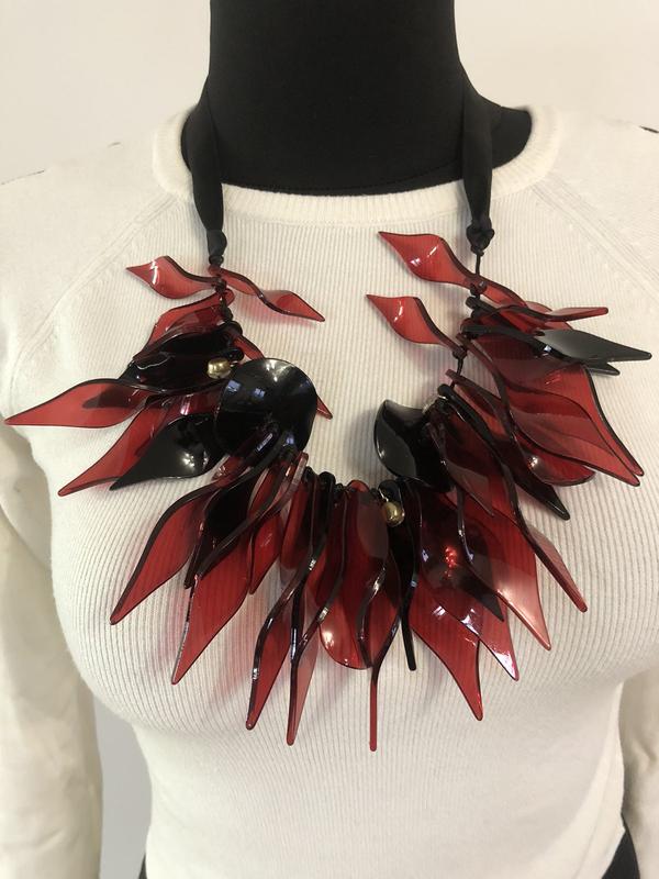 Предлагаем бижутерию бюджетного класса, хорошего качества и стильного дизайна. Ожерелье состоит из многих стилизованных прозрачных и непрозрачных листочков. Интересное украшение, выполненное в этно-стиле. Производство: Китай Тип изделия: ожерелье, колье Материал: пластик, текстиль Размеры: - длина самого ожерелья - 23 см - длина каждой ленты - 44 см Особенности: - длина регулируется с помощью атласных лент Цвет: - пластик - прозрачный красный, непрозрачный черный Комплектация: колье Доставка почтовым службом "Новая почта". Оплата на банковскую карточку или безопасной оплатой через Шафу. Приятного шоппинга и удачных покупок!
