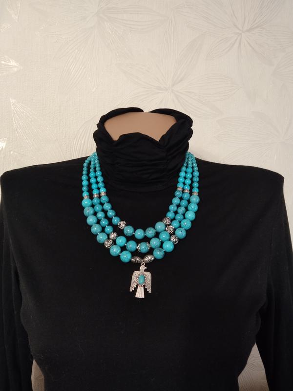 Трехрядное ожерелье из турквенита под бирюза, длина самого маленького ряда 48см.Кулон Сокил, размер 3,7х2,2см, символизирует победу над злом, силу, отражающую собственную справедливость бога огня.