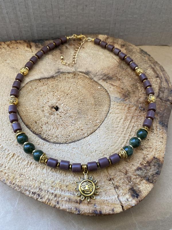 Колье из полимерной глины с подвесом солнышком. Очень красиво смотрится в белом солнце. Между бусинами гематит и являются латунные пластины. В инте есть видео. В едином экземпляре.