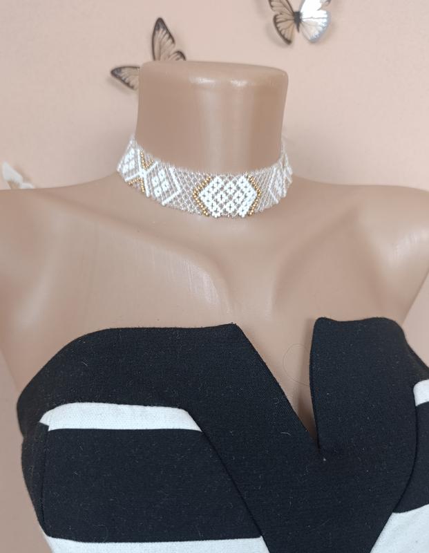 Силка изготовлена из чешского бисера в технике нанизки. Ширина 3 см, длина ожерелья около 31 см, застежка- завязки. По желанию заказчика можно изменить длину и цветную гамму ожерелья.