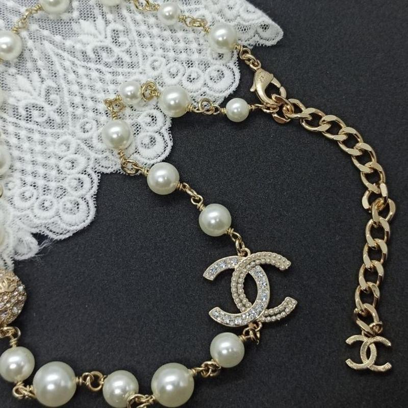 Колье цепочка золотая с жемчужинами chane l с камушками
