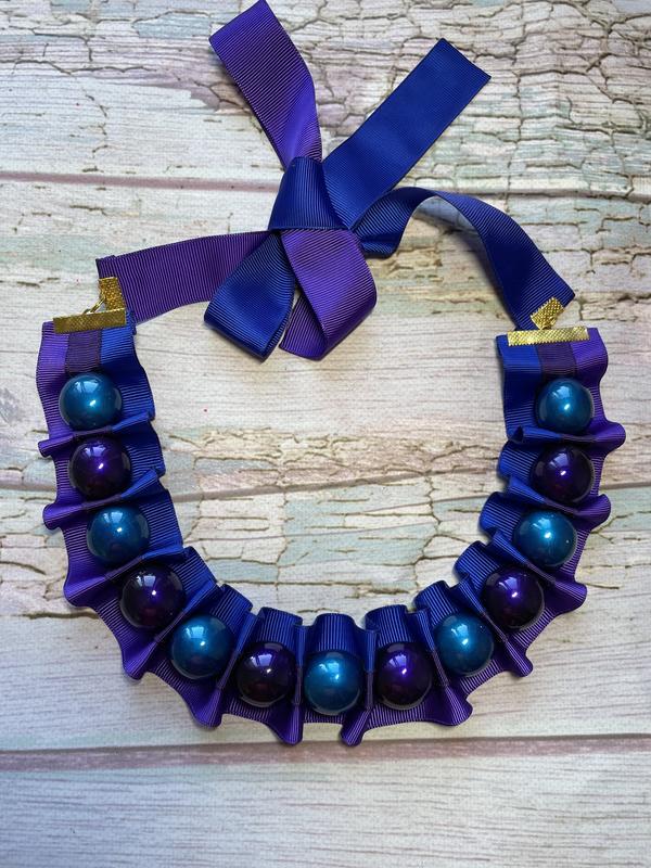 Корали с деревянными бусинами декорированы репсовой лентой. Длина ожерелья 30-40 см и дополнительно по 30-50 см ленты для завязывания.