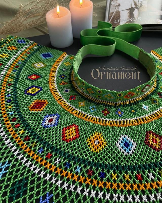 Самая большая и масштабная работа, которая когда-либо была в ORUNARNT IVANIUK - лемковская кривалька в сочном зеленом цвете на бархатной ленте На изготовление одной только стеечки ушло 3-4 рабочих дня, а общий вес полотна - 390 г, что примерно равно 32-33 тысячи бисерин! Крыльялка сочетает в себе 12 цветов, где каждый ромбик в рисунке неповторимый и особенный. По краю же украшена тремя видами бусин и надежно пришита мелкими стежками к изящной бархатистой ленте в тон украшения🪡 6000 UAH (в наличии) В наличии также в красном цвете✔️ Ширина стеечки - 2,5 см, общая ширина - 26 см Длина стеечки - 32,5 см, длина ленты- 1 м В работе использован качественный чешский бисер и бусины Preciosa и прочная бисерная нить Tytan Украшение ручной работы может стать эксклюзивным подарком или сувениром из Украины. Крыльяка будет в отдельном мешочке для хранения и подарочной упаковке🎁 Возможен повтор дуновки с другим цветом основы под заказ ✔️ Схема Людмили Сторож 471 не использовать свои фотографии в личных целях без разрешения.