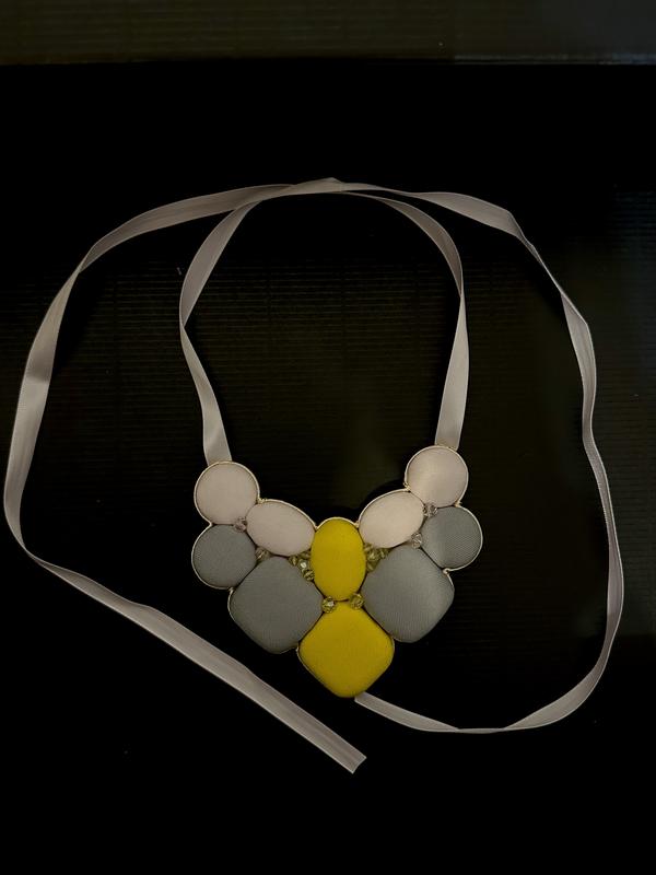 Стильне та унікальне намисто ручної роботи. Колірна гама – ніжний беж, сірий і яскравий жовтий. Основа – м'які подушечки, обрамлені тонким металевим контуром, прикрашені дрібним бісером. Застібається на довгу атласну стрічку, що дозволяє регулювати довжину.