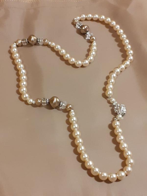 Ожерелье shell-pearls - прекрасный бюджетный вариант, выглядит, как морской культивированный жемчуг, с соответствующей натуральному жемчугу, поверхностью, но созданный по упрощённой технологии. Длина 55 см, жемчужины 8-9 мм, удобная застёжка. Бусы разделены на три части, разделители стеклянные прозрачные бусины и большая бронзовая бусина между ними. Застежка декорирована стразами. Цвет жемчужин кремовый с прекрасным обертоном. В прекрасном винтажном состоянии. Предположительно производство фирмы "Яблонекс" Чехия, 50-60 годы прошедшего века. Браслет производства начала 2000х годов Бонус к бусам. Слегка отличается по тону от бус но это не заметно. Дополнительные фото бус по запросу. Прежде чем оформлять покупку просьба написать и уточнить возможность отправки товара в течении пяти дней.